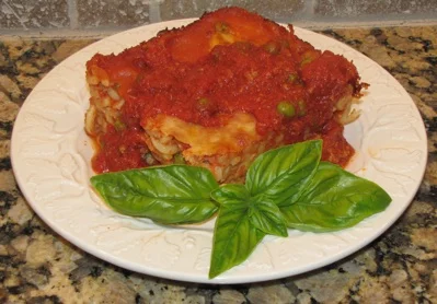 Circular shaped noodles layered with homemade meat sauce, béchamel sauce and peas.