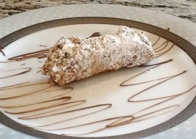 A crispy shell filled with a cannoli cream and chocolate chips.