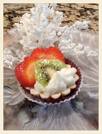 A mini tart with a cheesecake filling, topped with fresh fruit and a light glaze.
